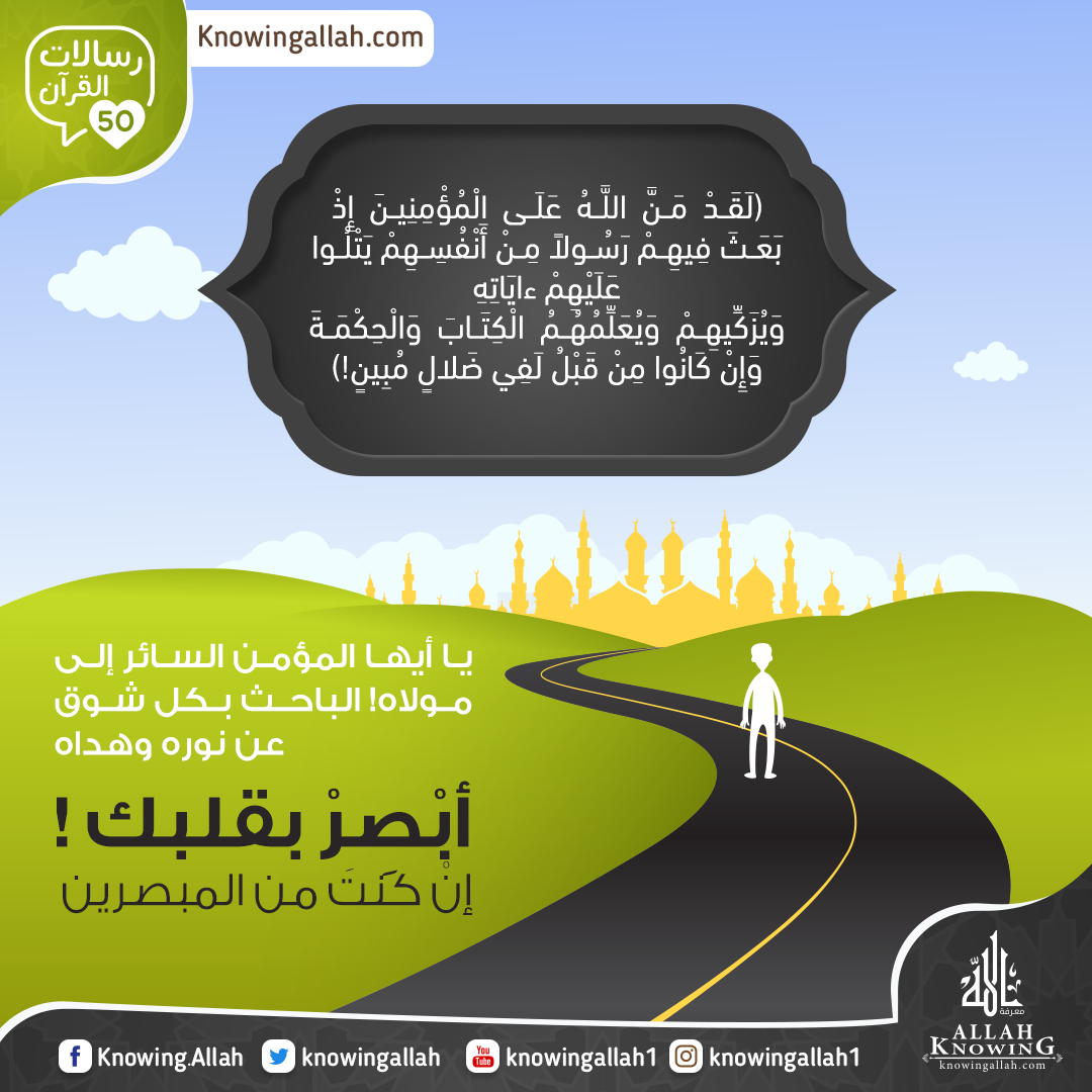 (لَقَدْ مَنَّ اللَّهُ عَلَى الْمُؤْمِنِينَ إِذْ بَعَثَ فِيهِمْ رَسُولاً مِنْ أَنْفُسِهِمْ يَتْلُوا عَلَيْهِمْ ءايَاتِهِ وَيُزَكِّيهِمْ وَيُعَلِّمُهُمُ الْكِتَابَ وَالْحِكْمَةَ وَإِنْ كَانُوا مِنْ قَبْلُ لَفِي ضَلالٍ مُبِينٍ!) (آل عمران:164)