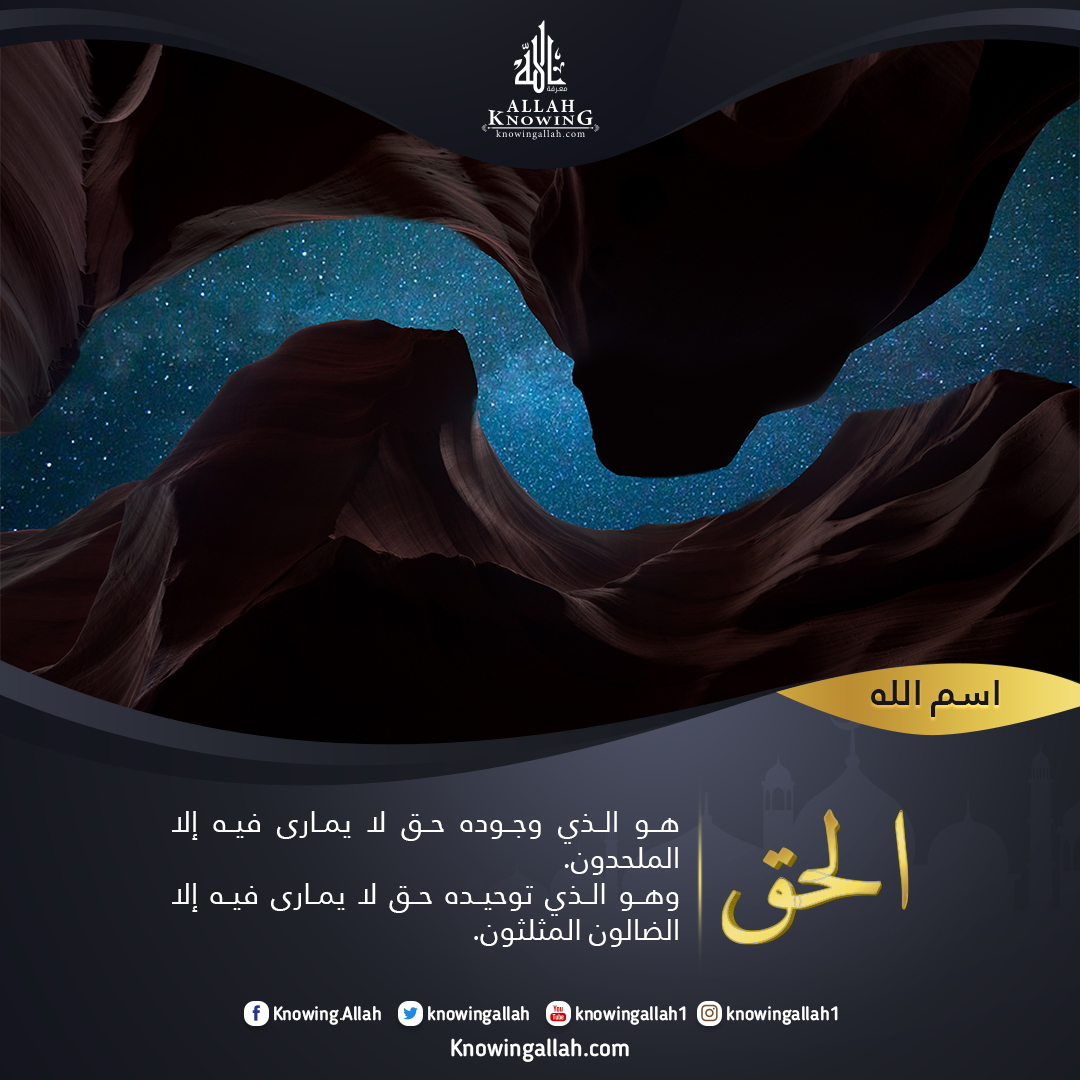 المعاني والدلالات لاسمه تعالى الحق: 1ـ هو الذي وجوده حق لا يمارى فيه إلا الملحدون. 2ـ وهو الذي توحيده حق لا يمارى فيه إلا الضالون المثلثون. 3ـ وهو الذي ربوبيته حق لا يمارى فيها إلا كل فرعون. 4- وهو الذي ألوهيته حق لا يمارى فيها إلا المشركون. 5ـ وهو الذي أسماؤه حق وصفاته حق ؛ لأن معانيها حقيقية بخلاف المخلوقين الذي يسمى أحدهم سلطان وهو خدام، أو يوصف بأنه كريم وهو بخيل، أو يقال له شجاع وهو جبان. 6ـ وأمره الكوني حق، فما شاء الله كان وما لم يشأ لا يكون. 7ـ وأمره الشرعي حق، لبعده عن الظلم والطغيان. 8ـ وقوله حق لخلوه من الكذب والبهتان. 9ـ ورسله حق وقد اهتدى بهم الأنام. 10ـ وكتابه حق ليس فيه زيادة أو نقصان. 11ـ ووعده حق، من أحسن أدخله الجنة، ومن أساء فإلى النيران. 12ـ خلق السموات والأرض بالحق ليبلو بني الإنسان، من أحسن فلنفسه، ومن أساء كان نصيبه الخذلان، وما خلقهم باطلاً ولا لعبًا، وما خلق الإنسان عبثًا. 13ـ والله تعالى يقص الحق، ويقول الحق، ويقضي بالحق، ويحق الحق، ويقذف بالحق، والله لا يستحي من الحق. ـ وهو تعالى يبطل الباطل ويمحو الباطل. عبادة الله باسمه تعالى الحق: 1ـ ينبغي للعبد أن يؤمن بالإله الحق ويكفر بكل الآلهة الباطلة المزيفة. 2ـ وينبغي ألا نقول في أسماء الله وصفاته إلا ما علمنا من الحق، ولا نقول بالظن فإنه باطل. 3ـ ومن آمن بأن أسماءه وصفاته حق، اتصف بما أمره الله الاتصاف به مما يوافق بعض صفاته في اللفظ، كالرحمة والكرم والعفو عن الناس. 4ـ ومن آمن بأن أمره الكوني حق، رضى بالقضاء و القدر ولم يعترض على أمر الله. 5ـ ومن آمن بأن أمره الشرعي حق، التزم بدينه واتبع أمره واجتنب نهيه. 6ـ ومن آمن أن وعده حق، اطمئن أنه سينصر دينه ويعز أولياءه. 7ـ ومن آمن أن حسابه حق، اجتهد في الصالحات حتى يكون الفوز قرينه، ويكون لهب النار أبعد عن جبينه، ولم يبتغ الهدى في غير دينه، واجتهد أن ينقي قلبه من كل باطل حتى لا يبقى فيه إلا الحق الذي نزل بالحق من الحق. 8ـ واجتهد أن يؤدي ما عليه من الحق إلى كل صاحب حق. 9ـ والرسل والأنبياء حق، وهم واتباعهم يهدون الناس للحق هداية دلالة، لكن الناس لا يتبعون الحق، إلا إذا وفقهم إلى ذلك ربهم الحق. 10ـ وأفضل الجهاد كلمة حقٍ عند سلطان جائر. 11ـ والموت حق، والبعث حق، والحساب حق، والجنة حق، والنار حق. 12ـ وأهل الكتاب يكتمون الحق، ويلبسون الحق بالباطل، ويقتلون الأنبياء بغير حق، ويظنون بالله غير الحق. 13ـ لا يجوز أن يقال في حق الله يجوز، وإنما يحق أن يقال في حق الله يحق ؛ لأن الخالق هو الذي أجاز للمخلوق فعله، وهو الحق الذي يُحق الحق ويُحق كل فعله. 14ـ والحق بمعنى الصدق والصواب والحقيقة والاستحقاق والاجتهاد والواجب والعدل والهدى والبصيرة.