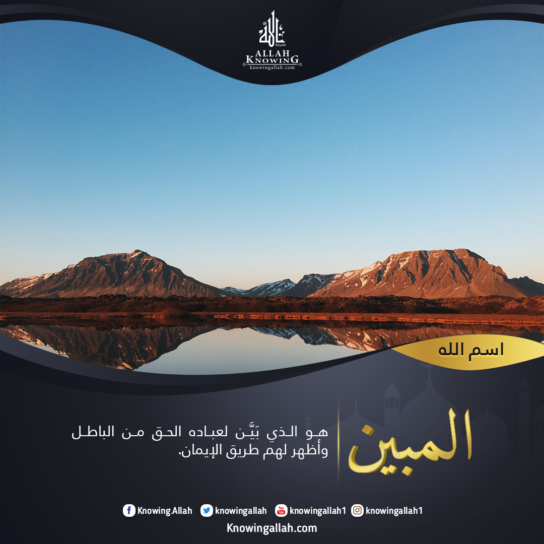المعاني والدلالات لاسمه تعالى المبين: 1ـ هو الذي بان وجوده بالأدلة الباهرة، وهو الذي بَيَّن بالحجة الدامغة والأدلة القاطعة أن وجوده حق بما أنزل من آياته المسموعة في القرآن، وآياته المشاهدة في الأكوان تدل على أنه الواحد الديان، فلا يستطيع مماراته أهل الباطل والبهتان. 2ـ وهو الذي بَيَّن لعباده الحق من الباطل وأظهر لهم طريق الإيمان. 3ـ فبين لعباده سبيل الرشاد حتى يتفكروا في عظيم خلقه، ويتذكروا يوم يعرضون عليه، ويشكروه على نعمه ويتبعوا أمره. 4ـ والله تعالى يريد أن يهدي عباده حتى لا يضلوا، وهذه هي إرادته الشرعية، ولكنه يهدي من يشاء، ويضل من يشاء بإرادته الكونية. 5ـ والله تعالى يفصل الآيات، وينزل الآياتٍ البينات. 6ـ والله تعالى فصل كل شيء، وبيَّن في القرآن كل شيء. 7ـ والله تعالى آتى موسى ـ عليه السلام ـ كتابًا مبينًا، وأعطاه حججًا قوية مبينة، وجعلها سببًا للانتصار على الفرعون في المناظرة والتبيين حتى يسهل عليه الانتصار في مجال المبارزة والتنشين. عبادة الله باسمه تعالى المبين: 1ـ ينبغي على المؤمن أن يستخدم قوة بيانه في نصر الدين وما يبهت به الشانئين، وليقتدي في ذلك بالرسل الأكرمين: موسى وإبراهيم عليهم تتابع التسليم. 2ـ ولا ينبغي للعبد أن يستعمل حجته في الصد عن سبيل رب العالمين أو اغتصاب حقوق الآدميين؛ فإنه لا يفلح عند الله سحر بيان الظالمين.